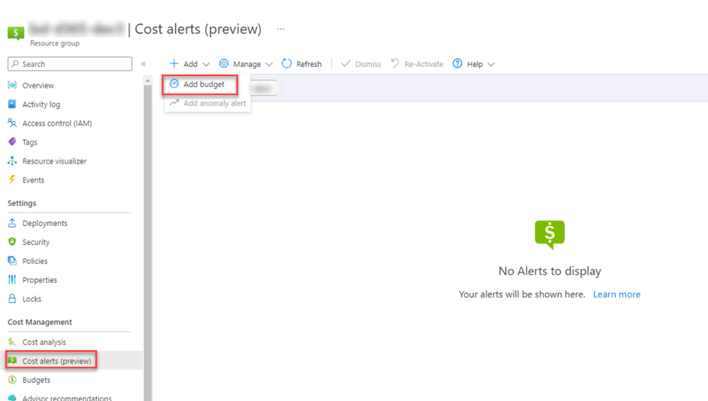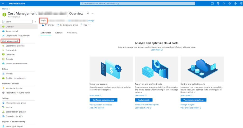 As you can see, Cost Management has Cost Analysis, Cost alerts, Budgets and Advisor recommendation that will help in tracking and managing the cost.