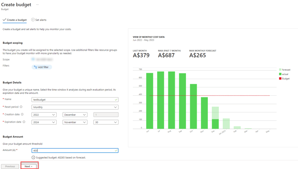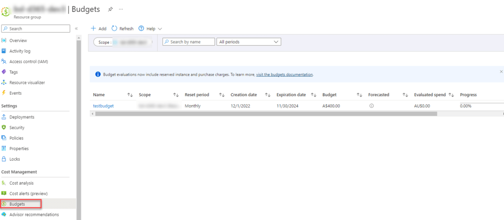 You can review actual and forecast cost of your azure resources from the azure portal. To review the cost, click on Scope in the Azure portal and select Cost analysis in the menu. For example, go to Resource groups, select a resource group from the list, and then select Cost analysis in the menu.