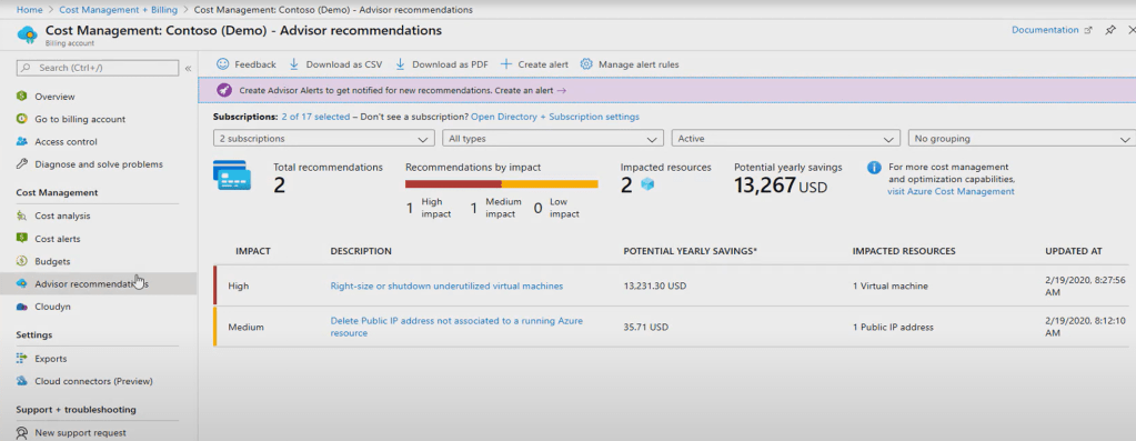 As the name suggests, Azure recommendations provides Microsoft’s best practices recommendations in terms of cost, security, optimizations etc. The recommendations are categorized in High Impact, Medium Impact and Low Impact. You can see the number of resources impacted for recommendation.
