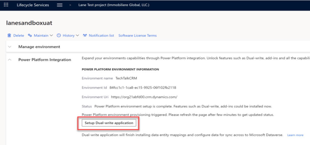 Power Platform can be linked with D365 F&O environment via LCS as shown below. A new Dataverse instance can be created, or an existing instance can be selected to link with F&O environment. The existing instance can be linked by providing Power Platform Environment ID in the Power Platform Integration Setup form which appears on click of below highlighted button. This step of linking environments is irreversible.