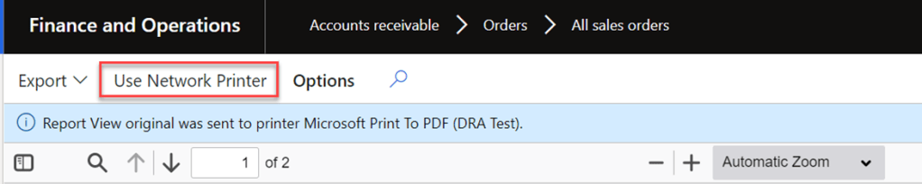 9. Now, you can test it in your reports by using Network Printer as shown below (after printing to screen), or setting up the print management.