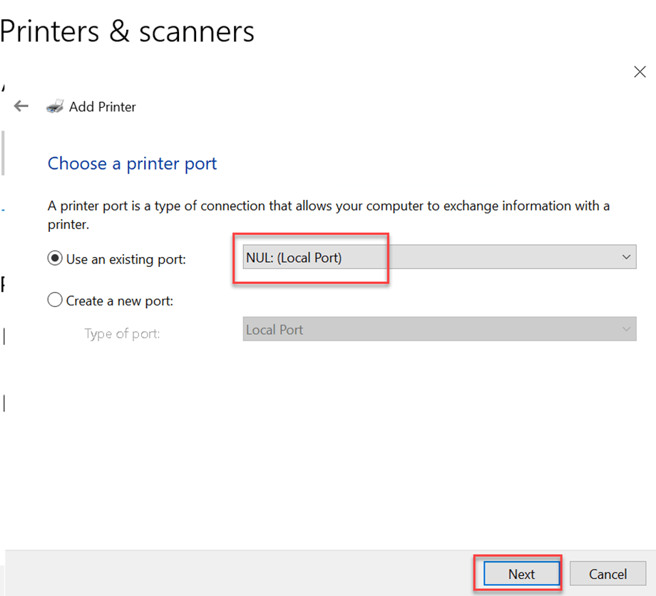 • Select Nul port and click Next.